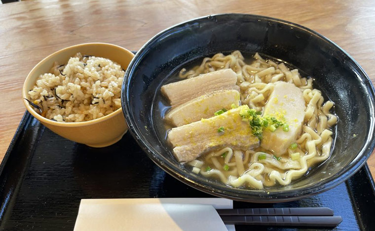 建物に向かって左側の「レストランやんばるシーサイド」では、爽やかな香りに食欲をそそられる、沖縄そばの「シークヮーサーそば」や、大宜味産蕎麦粉を使った「ざる蕎麦」、柔らかな肉質が特徴のアグー豚肉を使った「アグーとんかつ定食」など、やんばる、沖縄県産素材のメニューが中心です。窓から海を眺めながら、地元の味を堪能してみてください。