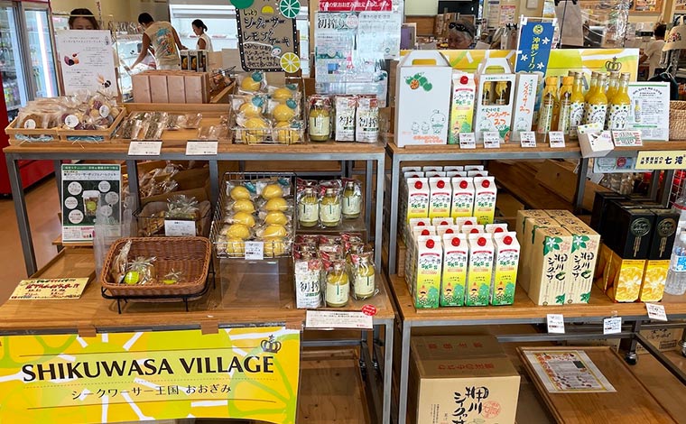 直売所を備えた物産コーナーでは、フレッシュな農産物や、泡盛をはじめとする酒類、お土産の他、売り場のメインを飾っていたのは、「シークヮーサー酢」や「シークヮーサー&レモンケーキ」など、シークヮーサーを使った数々の商品。