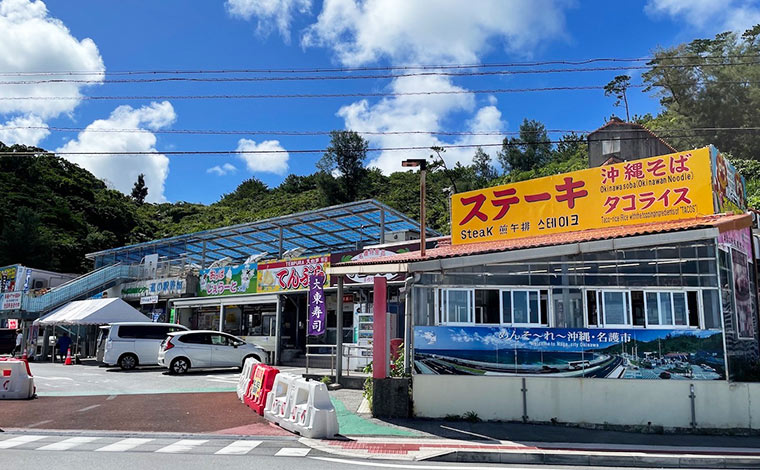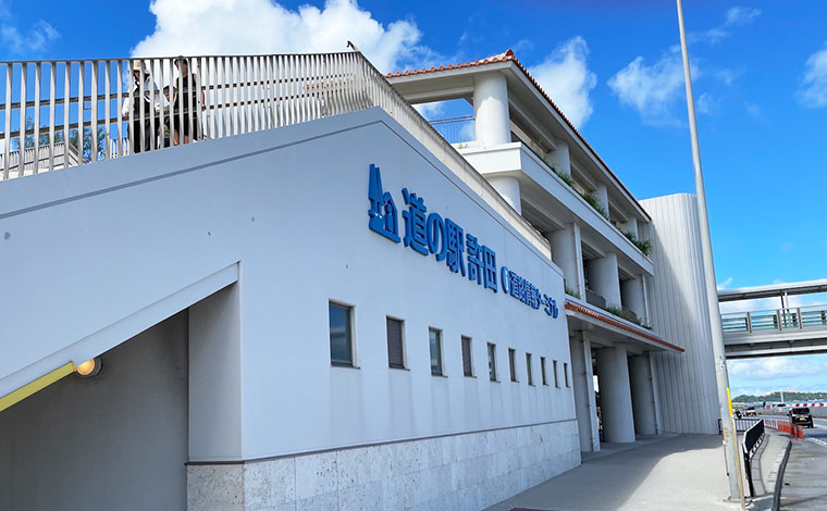道の駅「許田」は沖縄県内の道の駅第1号として1994年に誕生しました。2021年7月には併設の道路情報ターミナルがリニューアルし、毎日多くの利用者が訪れます。那覇方面から立ち寄る場合は海側の駐車場に車を停めて歩道橋を渡りますが、瀬底島方面から訪れる際は施設の目の前に車を停められます。リゾートからは車で35分程の距離なので、滞在時に買い出しに訪れることもできる立地です。