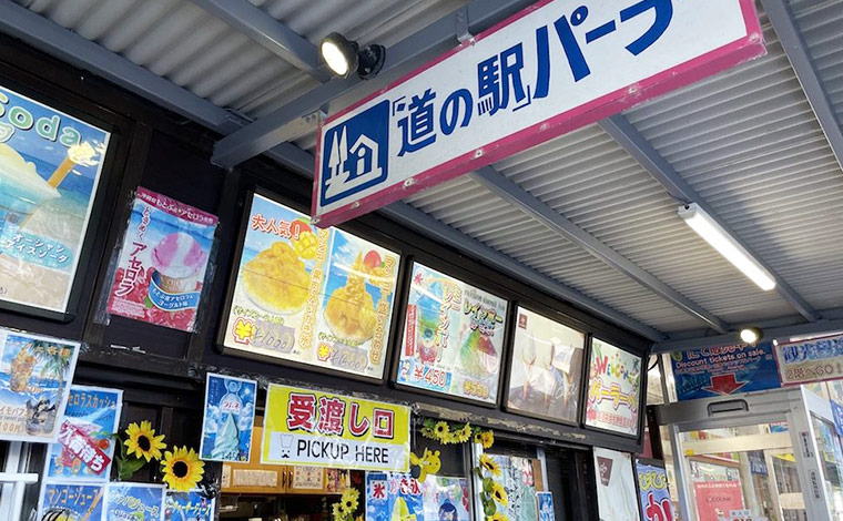 フードコーナーの「道の駅パーラー」では、南国フルーツをあしらったかき氷やソフトクリーム、フレッシュジュースなどが年間を通して食べられます。また、建物内のフードコートでは、タコスや鉄板で焼き上げるステーキ、沖縄そばなど、沖縄のソウルフードが味わえ、お昼時にはたくさんの観光客でにぎわいます。