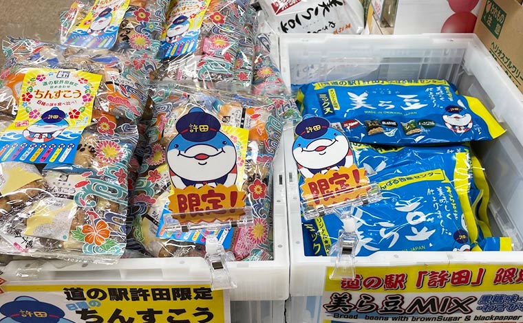 農産物と特産品売り場では、新鮮な野菜や果物の他、食品や調味料、お土産品をはじめ、オリジナルのマスコットキャラクターがあしらわれたお菓子などあらゆる商品が並び、その品揃えは圧巻!