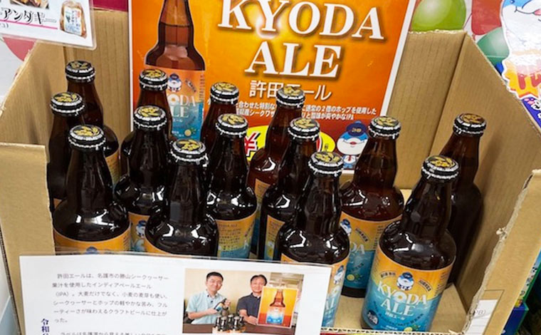 「30周年を記念し、名護市のヘリオス酒造さんとコラボしてクラフトビール「KYODA ALE(許田エール)」を作りました。大麦だけでなく小麦の麦芽も使い、名護市の勝山シークヮーサー果汁を加えているので、シークヮーサーとホップの軽やかな苦みと共に、フルーティーさが味わえるビールですよ」