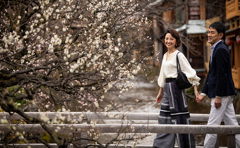 祇園を舞台とした映画やドラマにも登場する祇園巽橋(たつみばし)。白川にかかる石畳の巽橋は、指折りの人気のスポットです。一帯が伝統的建造物群保存地区に指定されており、風情ある街並みを楽しめます。桜の名所としても知られ、春の散策には特におすすめです。