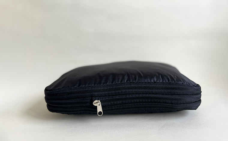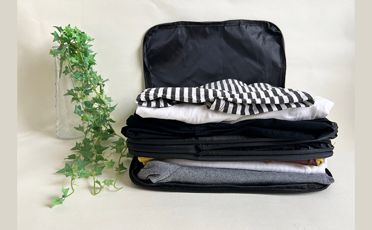 ダブルジッパーで簡単に圧縮できるトラベルポーチ。合計10枚ほどの洋服を収納しても、圧縮すればこの分厚さ。かさばる衣類もだいぶコンパクトに変身します。2段分けデザインなので、旅行中は使用前と済みの衣類で分けて活用できます。