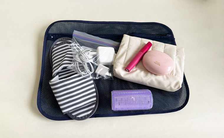化粧品ポーチや、旅先で使うスリッパ、充電器などの電子機器、洗濯バサミなど細々したものは大きなポーチ一つにまとめてしまうのがよいでしょう。