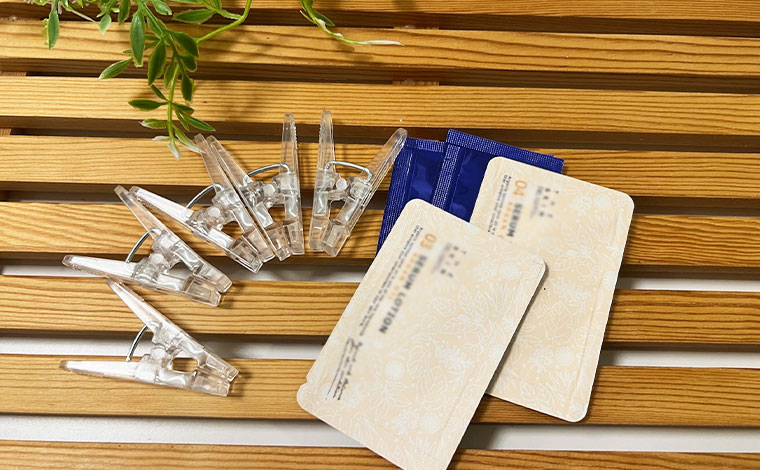 個包装の下に洗濯バサミを横向きに差し、立てるように置くと中の成分が外に漏れることなくきれいに保管することができます。