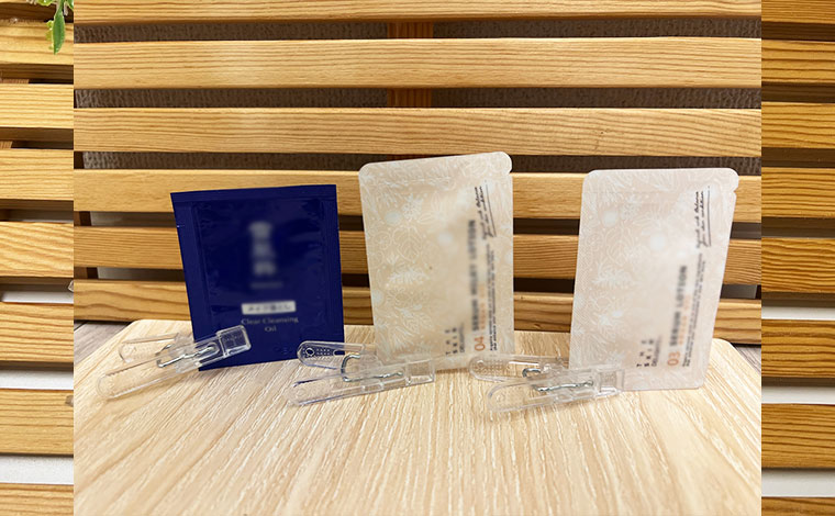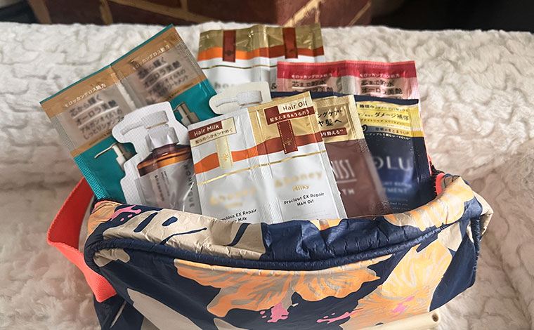シャンプーやコンディショナーは、使い切りの試供品タイプならコンパクト。一晩で一袋ちょうど使いきれてしまう量が嬉しい。ボトルタイプは一度開封すると中身漏れが気になりますが、そんな心配も不要です。