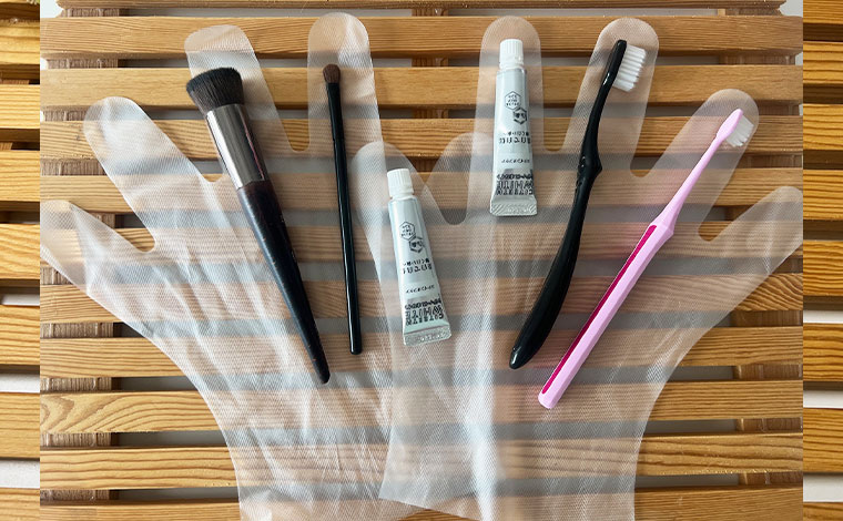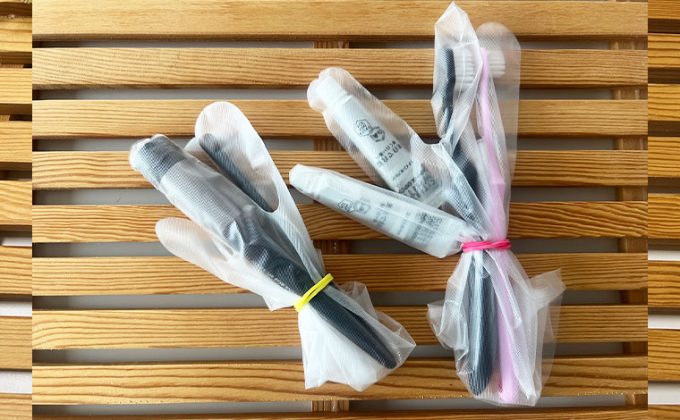 指の空間に1本ずつアイテムを収納し、ぐるぐるっと巻いて下部を輪ゴムなどで留めると衛生的かつコンパクトな収納が完成です!使用後の歯ブラシを再び入れるのは、衛生的ではないので、手袋を複数枚持参しておくとよいでしょう。リゾート滞在で、調理を楽しむ際にも使用できるので、活用方法はさまざまです。