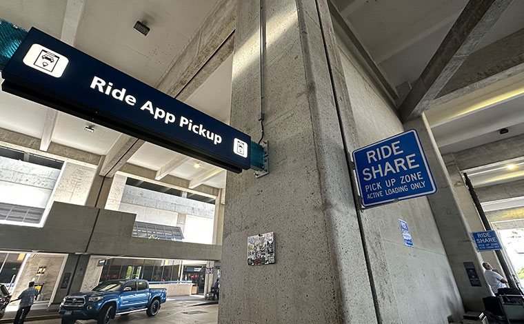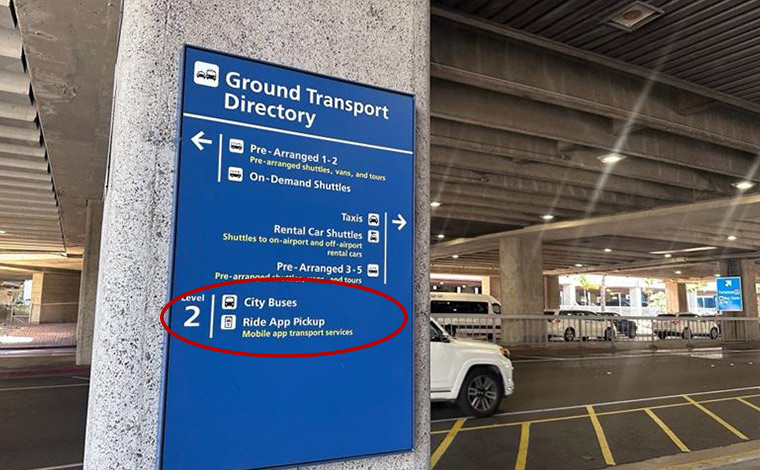 「ダニエル・K・イノウエ国際空港」では、タクシー乗り場ではなく、2階の出発ロビーにライドシェアの乗り場があります。国際線の到着後は、エレベーターやエスカレーターで2階へ移動し、ライドシェア専用乗り場から乗車しましょう。空港内には、3ヶ所のライドシェア乗り場が設けられています。ターミナル1の乗り場はロビー2の近く、ターミナル2の場合はロビー5と6の間、そしてロビー8付近です。日本からの到着便はターミナル2に到着します。