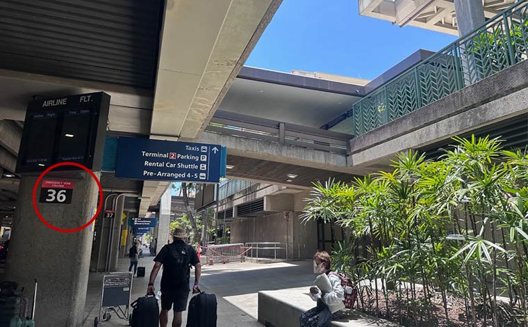 到着時に時間に余裕があれば、ハワイアン航空の国内線やアメリカ本土行きのターミナル1にあるロビー2付近の乗り場もおすすめです。屋根とベンチがあり、快適に待機できます。配車を依頼する前に、自分がどの乗り場から乗車するかを決め、アプリ上で正確に指定しておくことがスムーズに乗車するポイントです。