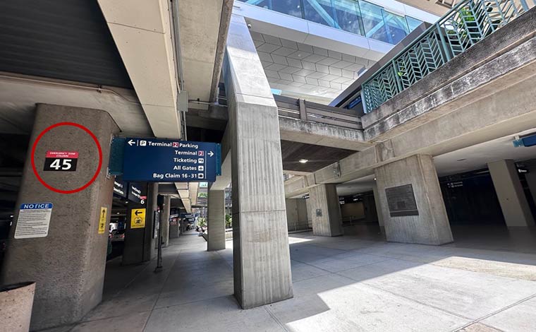 外の柱には番号があります。ターミナル2の出口付近には、「36」なので、ここから「45」を目指して進みます。
