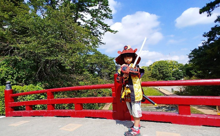 小田原城を見上げる位置にある常盤木門内は、ちょっとしたお土産屋さんとなっており、その奥で甲冑着付け体験ができます。甲冑を身につけた武士だけでなく、着物姿のお姫様、頭から足先まで体を覆った忍者の3種類から、なりたいキャラクターを選びましょう。武士は甲冑の他、陣羽織も選べます。それぞれお子様用と大人用があり、忍者の衣装は黒、赤、青の3色。刀などの小道具もそろっていて、かなり本格的です。