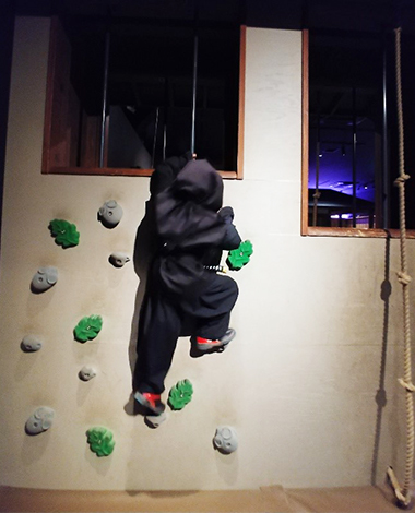 館内では壁をよじ登ったり、隠し扉を探したり、全身で忍者を体験。池の向こう側に渡る場面では、池に浮かぶ岩に乗ると足元が反応して光るなど、お子様はもちろん大人も楽しめる仕掛けが満載です。