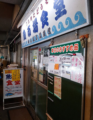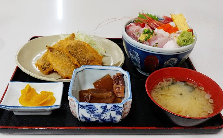 市場関係企業の事務所などが入っている魚市場のビル2階に、市場を眺めおろすようにお店があり、小田原漁港に揚がる魚を中心に近海の魚をつかった海鮮丼や刺身、フライ定食、煮付け定食などを提供しています。