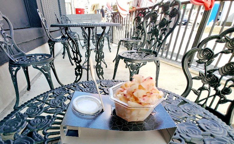 ここはかき氷専門店ですが、一般的な氷を削るかき氷ではありません。冷凍した果物をそのままスライスしているのです。材料は、旬の果物を調達して冷凍したものを使っているので、完熟の甘みが楽しめるのが特徴。上にかける練乳とシロップは自家製で、特に練乳はサラサラとした甘みのある牛乳といった感じ。凍った果物にとてもよく合います。