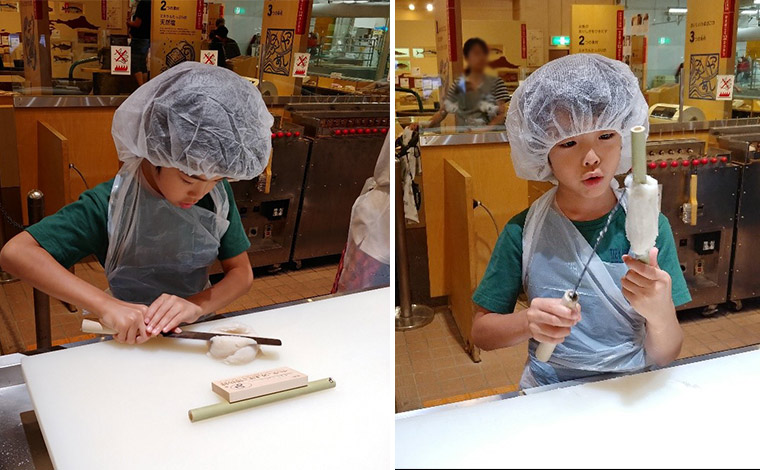今回は、かまぼことちくわの2種類が作れる「かまぼこ・ちくわ手づくり体験教室」(50分)に参加しました。かまぼこもちくわも、原料は同じく魚のすり身です。包丁を使い、まな板の上ですり身を練りながら形を整え、空気が入らないようにしながら、かまぼこ板にのせて成形すればかまぼこに、竹筒に巻き付ければちくわになります。