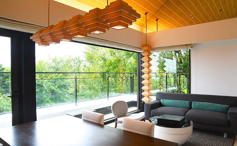 泊まった部屋は地下1階・地上1階の2階建て。1階はリビングダイニングと、バスルームなどの水まわり。この日はしっとりとした秋雨だったので、窓外の緑がみずみずしく、プライベートバルコニーからは相模湾が望めました。階段で地下に降りればベッドルーム、お布団も敷けるモダンな和室がひと続きになっていて、居心地のいいコンパクトさ。1泊でもわが家のようにくつろげそうです。