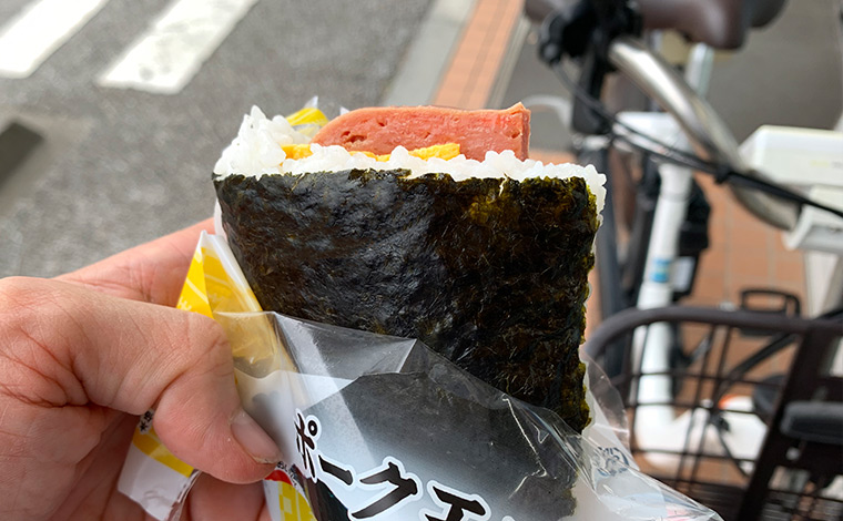 ここでうれしい休憩タイム。途中のスーパーで、沖縄のローカルフード「ポーク玉子」をいただきます。