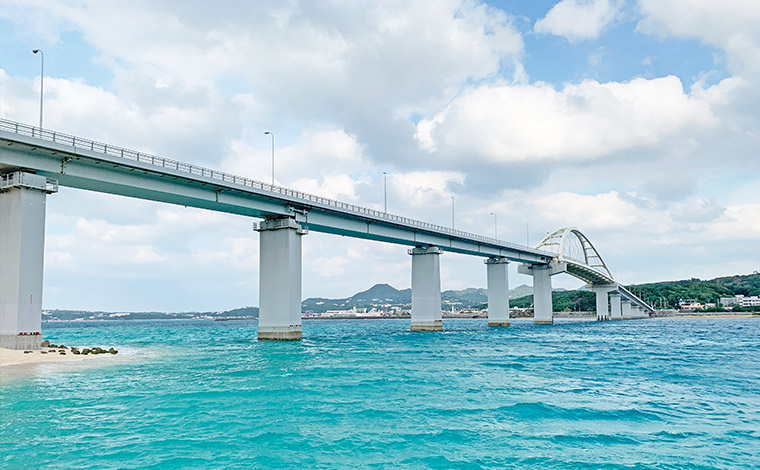 「ポーク玉子」効果もあり、瀬底大橋まであっという間に到着。目指すは、橋の先に浮かぶ太陽の光が差し込む瀬底島。