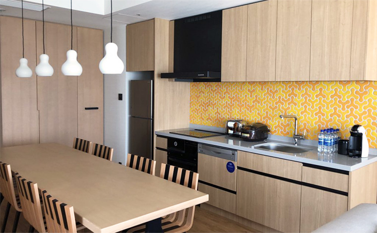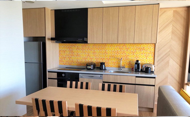写真は3ベッドルームタイプのダイニングとキッチンですが、実は全ての部屋タイプにIHコンロや食器洗浄機、炊飯器、トースター、カプセルタイプのコーヒーメーカー、電気ケトルが備えられています。