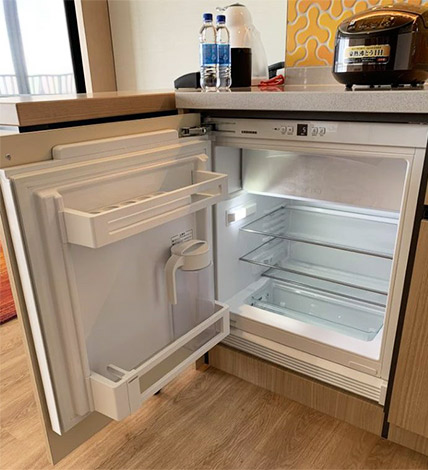 小型の冷蔵庫(庫内上部にコンパクトな冷凍スペースが備え付けられています)と、同じく小型の食器洗浄機、さらに電子レンジが用意され、リゾートに籠って自炊を楽しみたいメンバー様にとって必要十分な機能が確保されています。