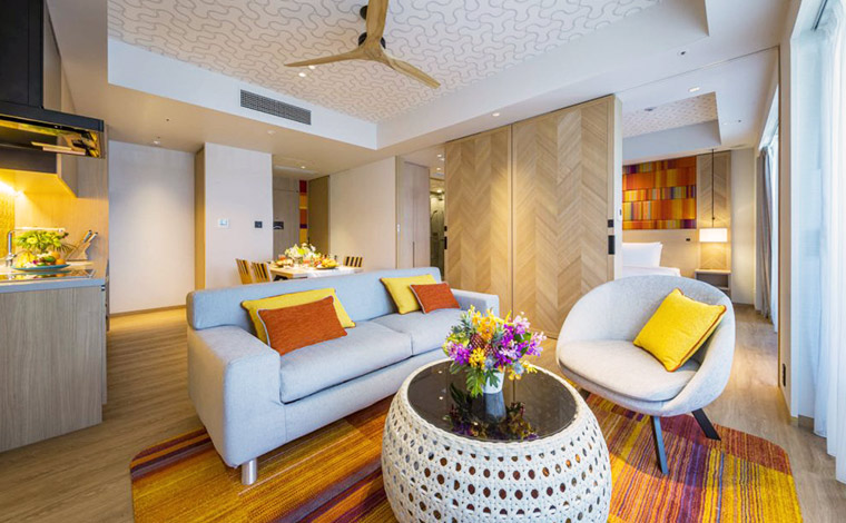 ザ・ビーチリゾート瀬底の大きな特徴は、スタジオから1〜3ベッドルームまで多様な部屋タイプがあり、同じタイプでもグレードが細かく分かれているところです。これはリゾートの設計に携わった開発スタッフのこだわり。シングルユースからご夫婦、お子様連れ、大家族でのバケーションを想定しながら、昨今ニーズの高まりを見せているワーケーションにも対応し、あらゆる旅のかたちに応える工夫を施しています。