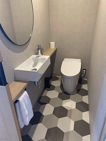 ザ・ビーチリゾート瀬底のお部屋にあるトイレは、全てTOTO社製のウォシュレット付き。モダンな柄のタイル床と、控えめでシックな色合いの壁面の組み合わせによって、清潔感を保ちながら落ち着いた空間美を演出しています。
