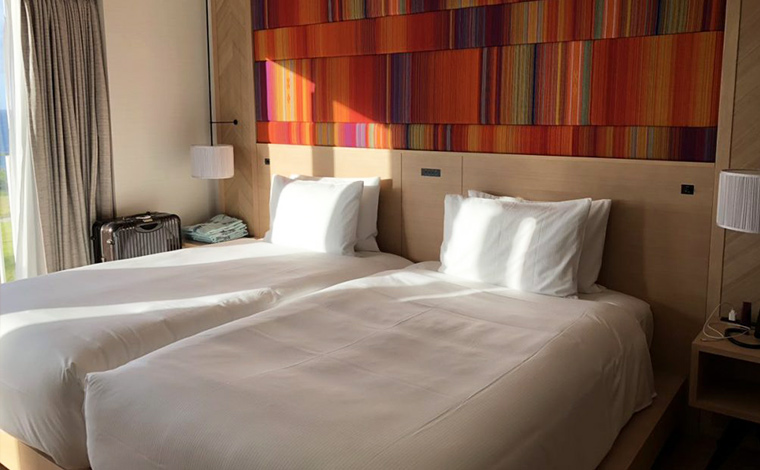 スタジオタイプ、1〜2ベッドルームタイプには、セミダブルサイズのマットレス2台が並ぶプラットフォームベッドを設置。1つの土台に2つのマットレスが並んで置かれているので、大きなベッドとして利用が可能です。