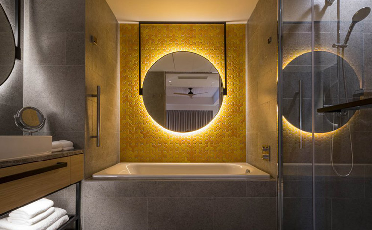 沖縄の珊瑚をイメージしてデザインされた黄色とオレンジ色のタイルも、全室共通のアイコンになっています。
