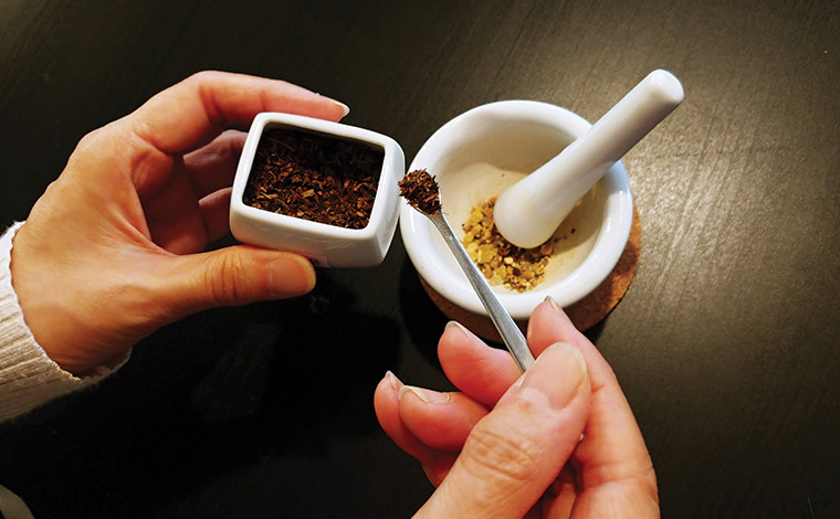 ワークショップでは最初に、8種類の天然香料の説明を、香りをかぎながら聞き、専用のスプーンで乳鉢と呼ばれる器に入れて軽く磨り潰します。同じ香料を2杯分使ったり、0.5杯として少しだけ入れたりすることもでき、香料が追加されていくごとに香りが変化していくのも興味深いものです。体験では白檀を中心に作り、帰宅後はタオルとともに置いているので毎日穏やかな香りが楽しめます。