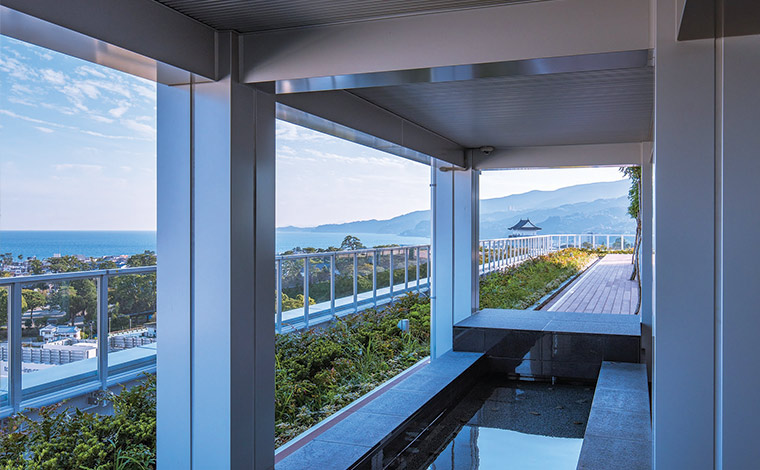 小田原駅前にあるミナカ小田原には、小田原市内を一望できる「展望足湯庭園」があります。
