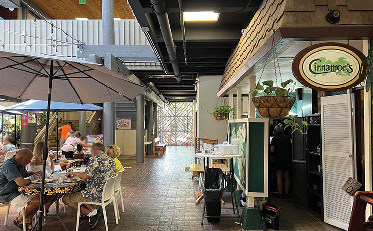 カイルアタウンに着いたら、まずは朝食を。カイルアにはパンケーキの名店がいくつかありますが、中でもローカルに大人気なのが「シナモンズ・レストラン」。1985年の創業以来、約40年にわたってこの地でレストランを営んでおり、とくに週末には長い行列ができることも多いレストランです。