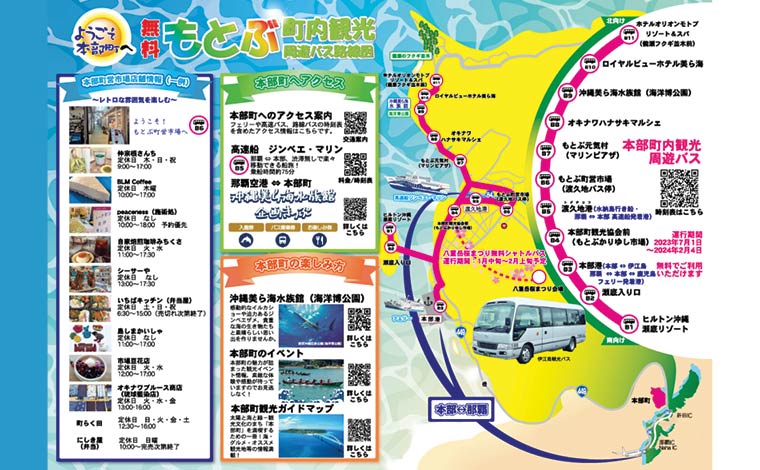本部町をぐるっと周遊している無料バスがあるのをご存じですか? 本部町周遊バスは、ヒルトン沖縄瀬底リゾートを出発し、フェリーが発着する本部港や渡久地港を通り、もとぶ町営市場や沖縄美ら海水族館など、観光スポットを巡るとても便利なバスです。