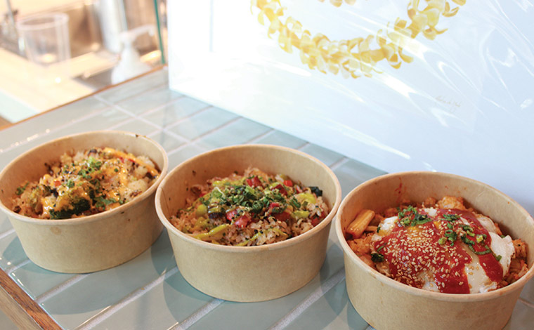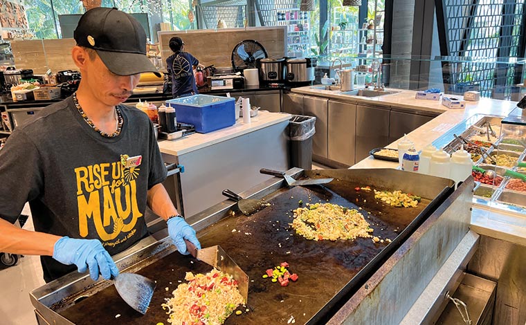 特におすすめなのが、目の前の鉄板で作ってくれる「フライドライス(チャーハン)」のコーナー。5つのシグネチャーメニューから選ぶことも、野菜、肉、ソースなどの具材を自分で選ぶこともできます。これで10.99ドルは、今のハワイではとてもリーズナブルなのでおすすめです。
