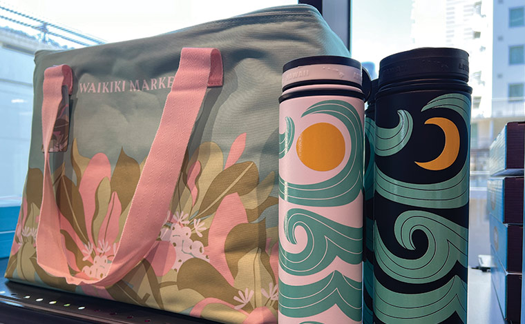 ワイキキマーケットでは、オリジナル限定アイテムも充実しています。ハワイらしい「レイ」をかたどったトートバッグや保冷バッグ、海でも活躍する大きめのビーチバッグなどはお土産にしても喜ばれること間違いなし。ここでしか買えないデザインのウォーターボトルなどもハワイを連想させる波のモチーフに太陽や月のデザインが印象的な2色展開で、とても素敵です。