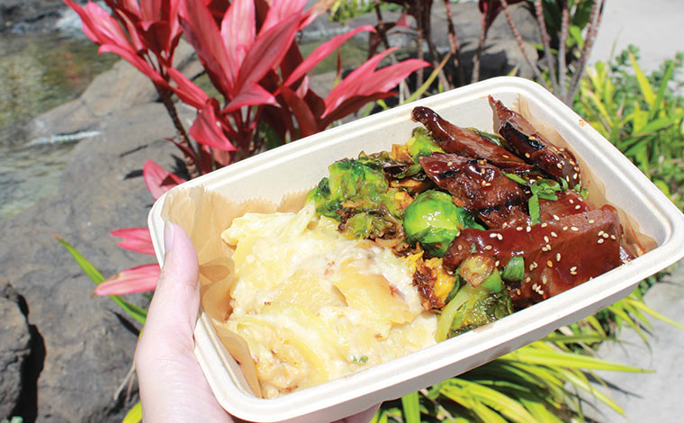 写真はカルビにキムチ芽キャベツとポテトクリームを合わせたプレート。ボリュームたっぷりで16.99ドル。2人で食べても充分な量なので、リゾートやホテルのお部屋へ持ち帰り、家族や友達でシェアして食べるのもおすすめです。