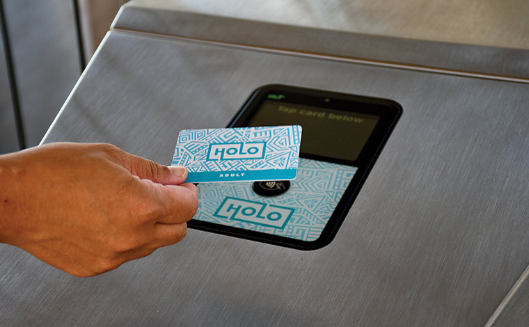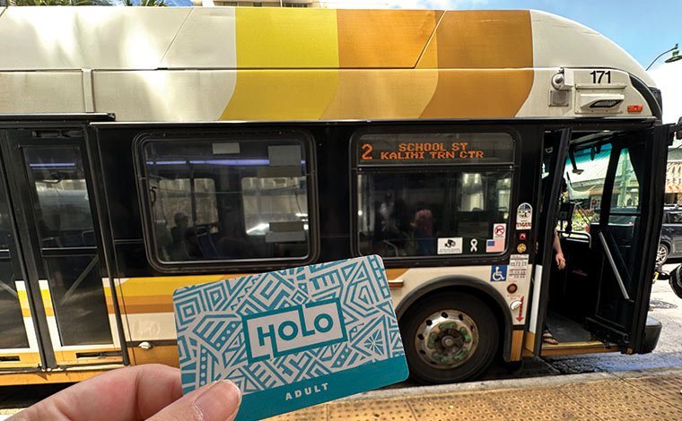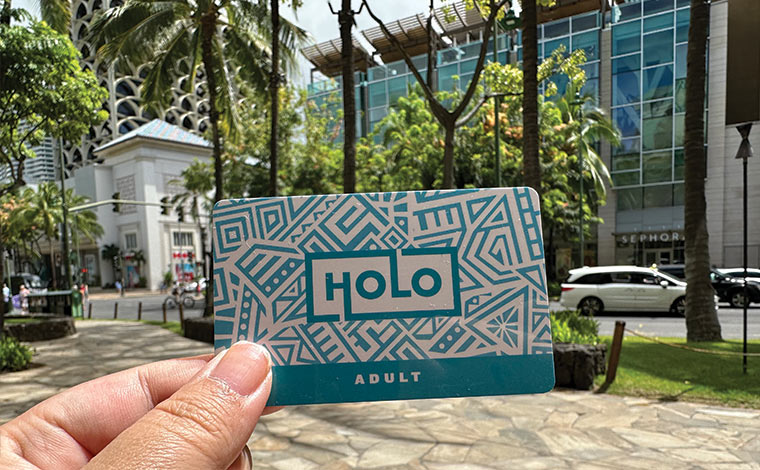 2021年7月から現金払いの紙のチケットに代わって導入されたのが、交通系カード「Holoカード」です。日本のSuicaやPASMOのように、事前にチャージしたHoloカードを、カードリーダーにタッチするだけで支払いができ、小銭を用意する必要がありません。しかも乗車後2時間半以内であれば、追加料金なく乗り降りできます。さらに、同日に3回以上乗車すると、自動的にワンデーパス(7.5ドル)に切り替わるという優れもの。ハワイ滞在中、ザ・バスに何回も乗車するなら、持っておくと便利です。