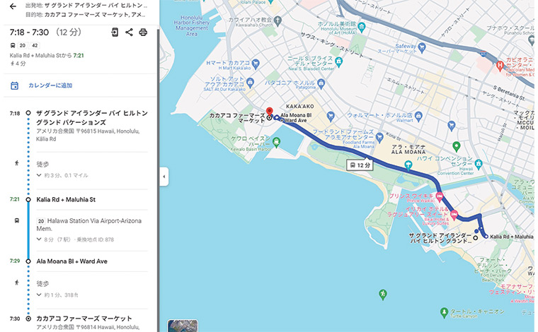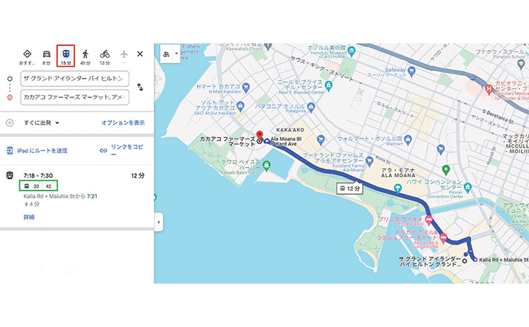 Googleマップ上で、現在地と目的地、出発時間を入力し、交通手段としてバス(上記の赤枠)を選択します。すると、ルートが表示されます。今回は、滞在先のザ・グランドアイランダー・ヒルトングランドバケーションズクラブからカカアコファーマーズマーケットまでの行き方を検索します。検索結果では、現在地からバス停までの行き方、乗車するバス停から目的地近くのバス停、降車したバス停から目的地、バス番号をひと目で確認できます。ルートは、地図上の青い線、乗車や降車するバス停は、「ストリート & ストリート」の交差点名で表示。(この場合、乗車するバス停はKalia Rd+Maluhia St、降車のバス停はAla Moana Bl+Ward Ave)、そしてルート番号(この場合は、緑枠にある20番か42番)です。