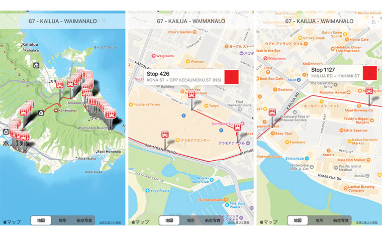 ② ①で表示されたマップを拡大すると、乗車場所や降車場所を確認できます。アラモアナセンター周辺には、3つのバス停があることがわかります(上記画像の中央)。